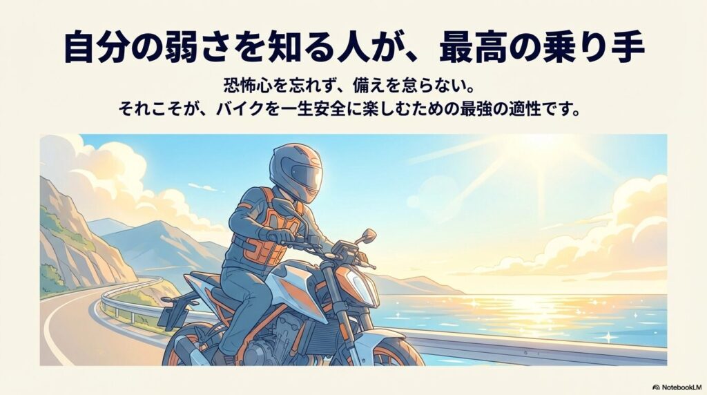 自分自身の技術に対して常に謙虚でいられない方は、バイクという物理的な余裕の少ない乗り物にはあまり向いていないかもしれません。常に「自分は未熟かもしれない」と冷静に自分を客観視し、限界の少し手前で走る余裕を持つことが何よりも大切ですね。