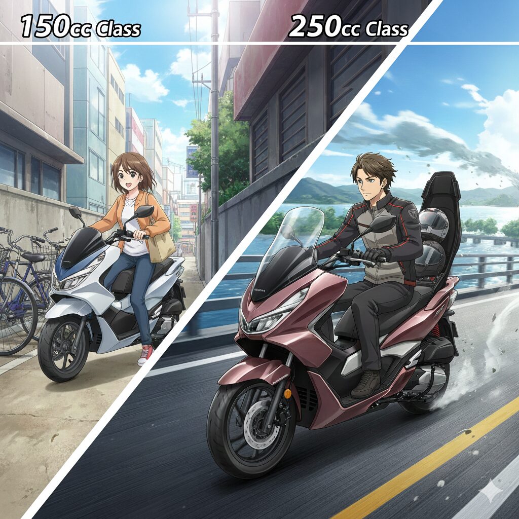 PCX160のような150ccクラスと、フォルツァのような250ccクラス。どちらも高速道路に乗れますし、税金や保険の区分も同じです。では、わざわざ価格が高く、車体も重い250ccを選ぶメリットはあるのでしょうか?