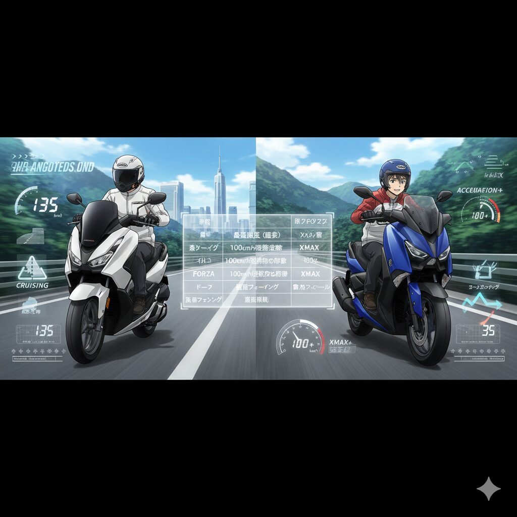 ギリギリのパワーで100km/hを出すのと、余裕を残して100km/hで流すのとでは、ライダーの疲労度が天と地ほど違います。フォルツァは最高速の伸び代が大きいため、100km/h巡航時でもエンジンに余力があり、振動や騒音が少ないのが特徴です。一方、XMAXは最高速アタックよりも、信号待ちからのダッシュや、ワインディングロードでの軽快なハンドリングに重きを置いたセッティングになっています。