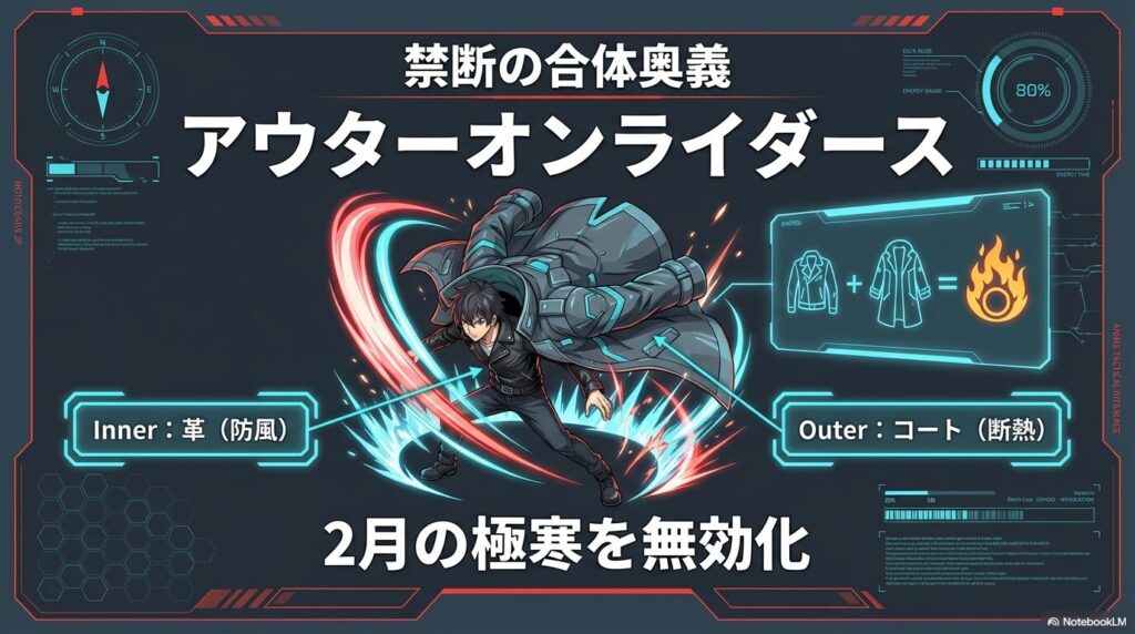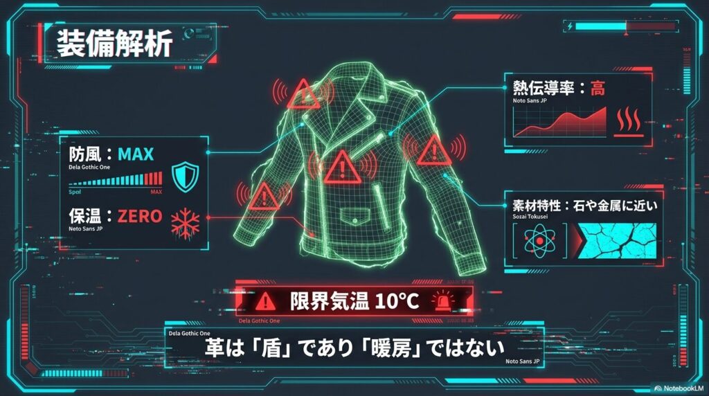 - 内側(ライダース):防風性の高い革が体に密着し、体温で温まった空気を逃さず、かつ冷気をシャットアウトする。