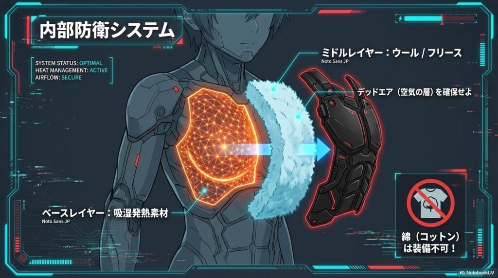 1. ベースレイヤー(肌着):吸湿発熱素材