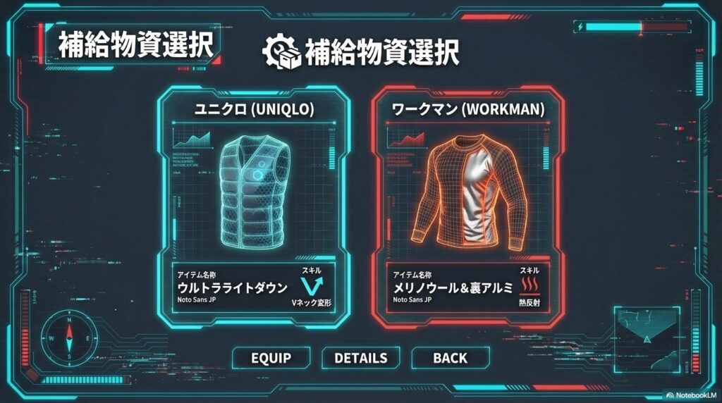 「機能性の高いインナーが必要なのはわかったけど、そんなにお金はかけられない…」という方も安心してください。私たちには強い味方、ユニクロとワークマンがついています。この2大ブランドを賢く活用することで、コストを抑えながら最強の防寒システムを構築できます。