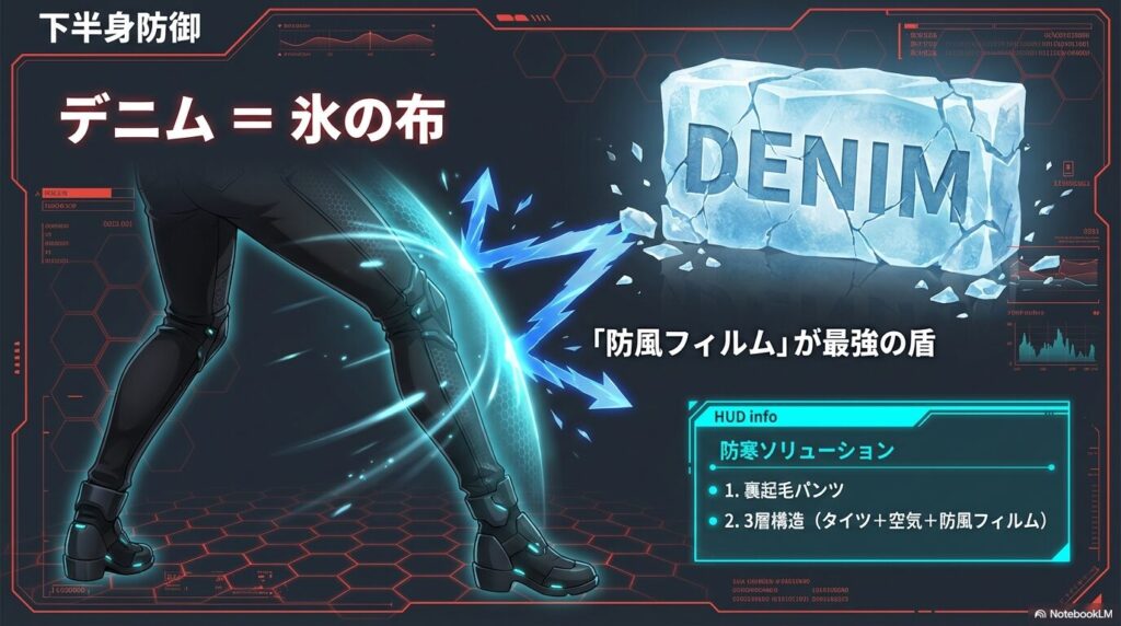 上半身はバッチリ防寒しても、下半身がおろそかだと底冷えしてしまいます。特に男性の場合、「とりあえずデニム(ジーンズ)」を選びがちですが、冬のデニムは正直言って「氷の布」を纏っているようなものです。コットン素材は通気性が良すぎるため、風が吹くと一瞬で体温を持っていかれます。