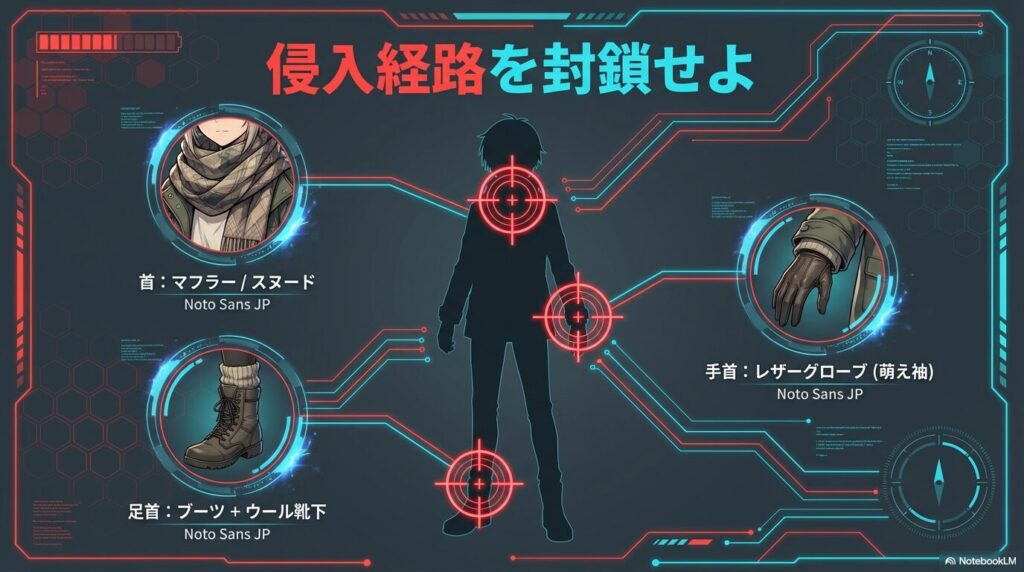 - 3つの首を守る:マフラー、グローブ、ブーツで冷気の侵入経路を断つ。