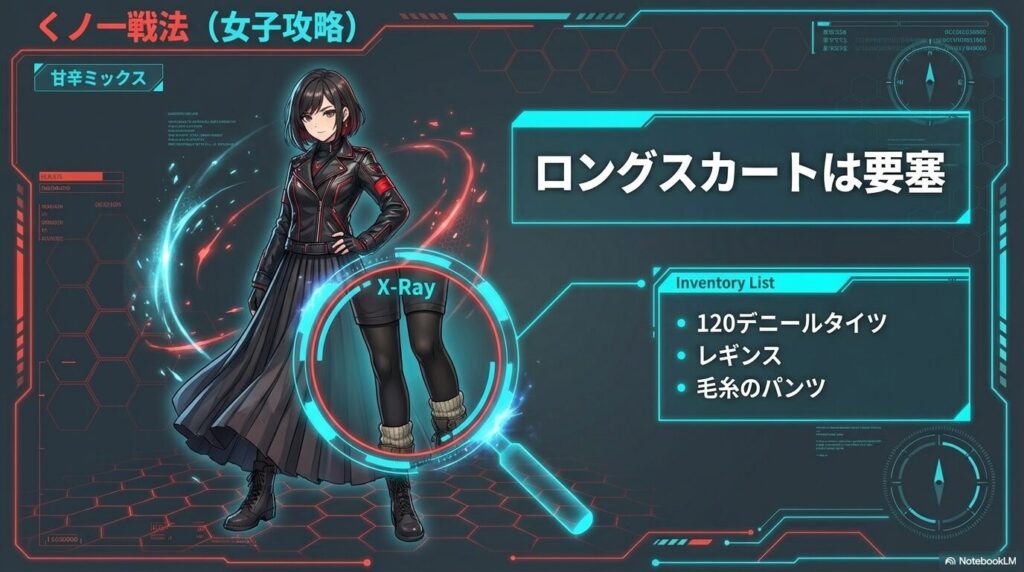 例えば、パンツスタイルの場合、中に厚手のタイツを履くとどうしても脚が太く見えたり、膝が曲げにくかったりします。しかし、ふんわりとしたロングスカートなら、その下に以下の装備を仕込むことが可能です。
