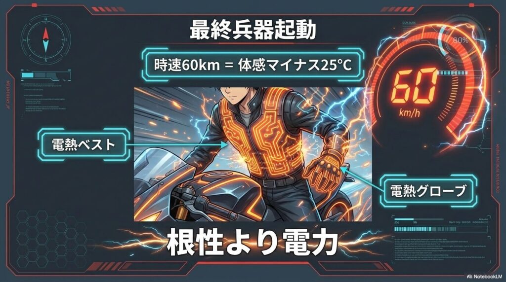 - テクノロジーに頼る:バイクに乗る時は迷わず電熱ウェアや防風素材を導入する。
