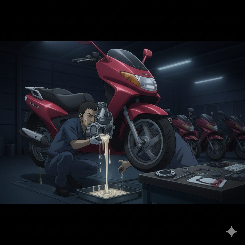 フュージョンは水冷エンジンを搭載していますが、経年劣化により「ウォーターポンプのメカニカルシール」という部品が破損するトラブルが後を絶ちません。このシールがダメになると、冷却水(クーラント)がエンジン内部のオイルラインに漏れ出してしまいます。
