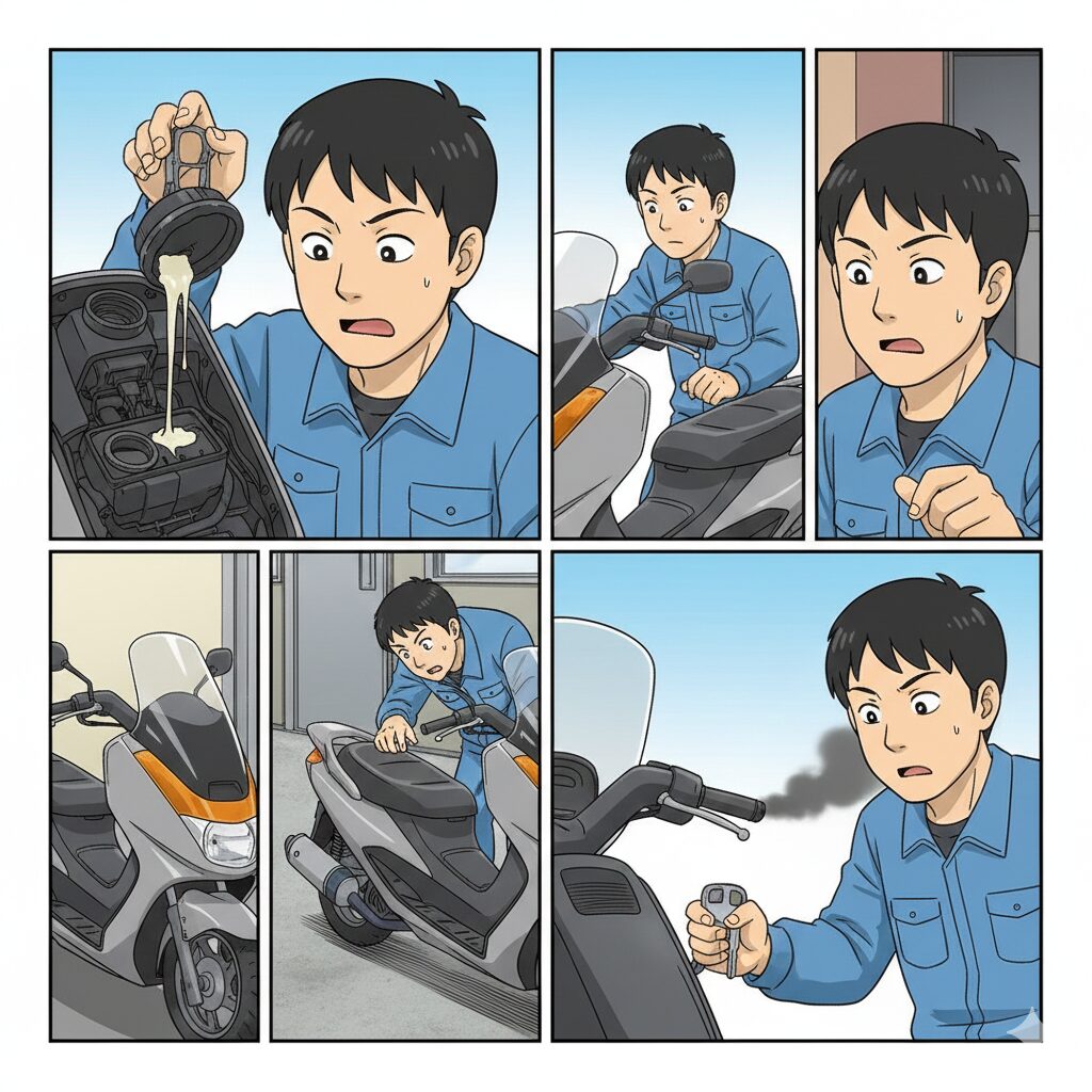 こうなると、エンジンオイルと水分が混ざり合い、オイルが白濁して「カフェオレ」のような状態になります。当然、潤滑性能は著しく低下し、最悪の場合はクランクベアリングやピストンが焼き付き、エンジンが全損してしまいます。